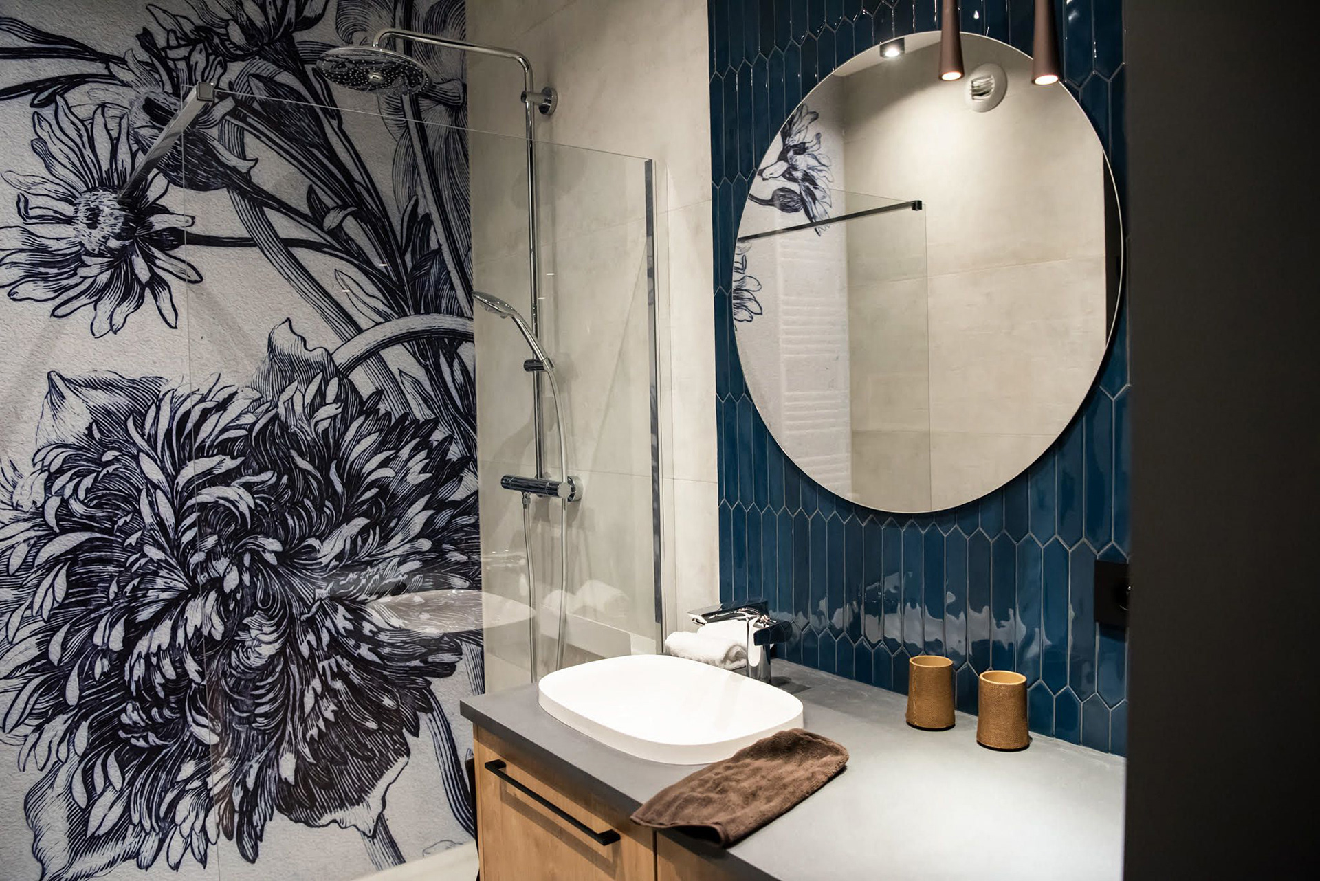 Apartament o powierzchni 50m² zlokalizowany na Kępie Mieszczańskiej w ścisłym centrum Wrocławia. Apartament składający się z dwóch pokoi, łazienki oraz tarasu zaprojektowany został dla pary. Przeszklenie części łączącej sypialnię z pokojem dziennym, by nadać całości przestrzeni i nowoczesnej formy było głównym zamysłem projektu. Właściciele pragnęli otwartej przestrzeni, elementów loftowych, jak i eleganckiej stylistyki wnętrza. Sypialnia ze szklanymi ścianami i przesuwnymi drzwiami dodaje optycznie przestrzeni i nabiera ekstrawagancji. Beton na ścianie w formie sztukaterii, szafa garderobiana wykończona szkłem i orzechem łączy się płynnie z częścią dzienną. Salon połączony z pełnowymiarową kuchnią uzupełniają się spójnie kolorystyką i materiałami oraz nietuzinkowymi fakturami. Konsekwencja stylistyczna zostaje przełamana w łazience, tam wita nas tapeta o roślinnej tematyce w intensywnej barwie granatu, gres uzupełniający mural ścienny oraz drewno w odcieniu dębu naturalnego nadało swobody i przełamały wszelkie konwenanse na temat tego, jaka łazienka może być.